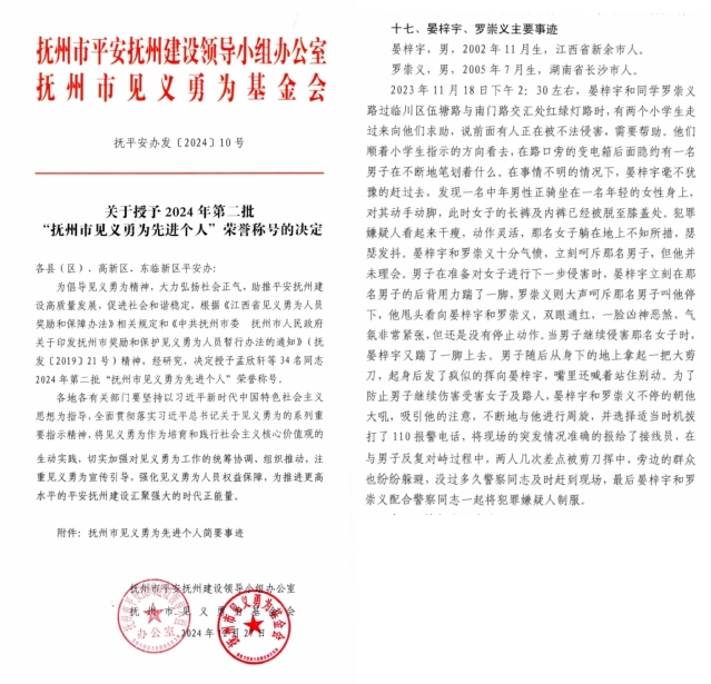 [转之校园网首页]1月10日,抚州市平安抚州建设领导小组办公室(抚州市见义勇为基金会)授予东华理工大学国防教育学院学生晏梓宇、罗崇义2024年第二批“抚州市见义勇为先进个人”称号。