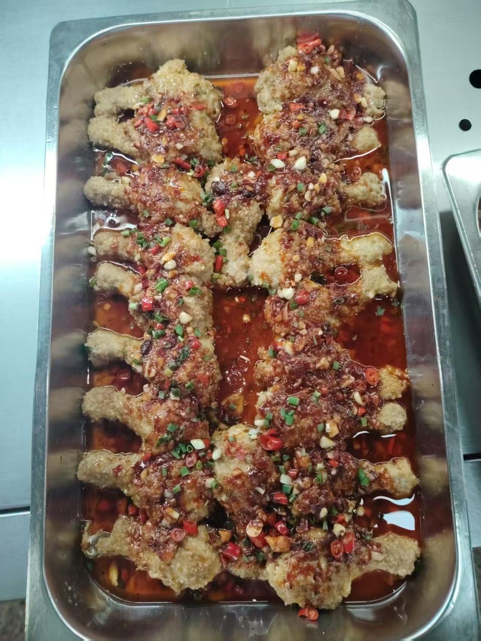 枫一食堂首推菜品:盐焗鸡。咸香入味,皮爽肉滑的经典粤菜。盐焗鸡的精髓在于:咸香入味:粗盐的咸香渗透到鸡肉的每一丝纤维,带来层次丰富的味觉体验。皮爽肉滑:经过盐焗的鸡皮爽脆可口,鸡肉鲜嫩多汁,口感层次分明。色泽金黄:盐焗后的鸡肉呈现出诱人的金黄色,让人食欲大增。该食堂还有:肉质鲜嫩的食汁蒸鱼、口味醇厚的芋头烧鸡,每一道菜都经过精心选材,细心烹制。