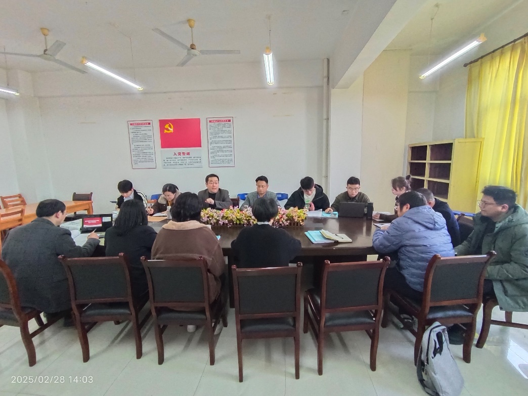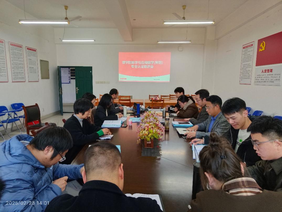 2025年2月 28日下午,理学院在抚州校区国防科技楼 801会议室召开数学与应用数学(师范)专业认证工作推进会。院长颜七笙、数学教育系全体教师、数学系部分教师及相关科室负责人参加会议,会议由副院长李迎主持。