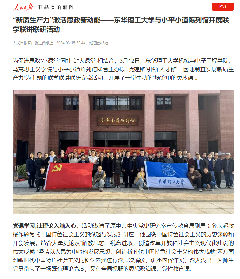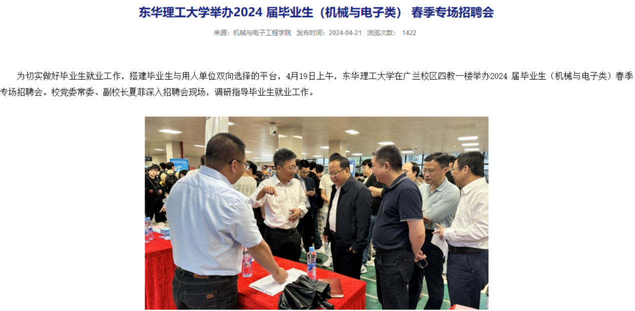 7月,学院积极引导学生将课堂教学和社会实践结合起来,在社会大课堂中感受时代脉搏、领悟人生价值。东华理工大学党委副书记邱建丁出席学院联合金桥慧景社区的“牢记嘱托强国有我 行走赣鄱感恩奋进”暑期大思政实践活动并给“七彩假期”志愿服务活动的实践队员们讲授思想政治教育课,党委常委、副校长夏菲一行前往湖北襄阳看望2021级机械工程专业在企业实习的228名学生,并讲授思想政治教育课;学院红色电波实践队在上饶德兴绕二镇、花桥镇等地开展的暑期社会实践活动,获评为2024年江西省大中专学生志愿者暑期“三下乡”社会实践优秀团队。