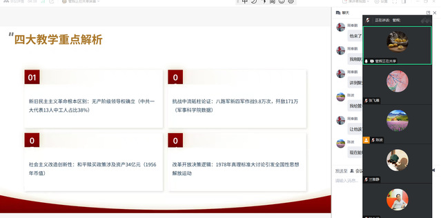 2月28日晚上,《中国近现代史纲要》(简称“纲要”)课程组开展说教材、说章节、说方法“三说一体”集体备课会,备课会由课程组负责人张飞雁主持,学院督导组组长陈明华参加并点评,全体课程组教师参加。
