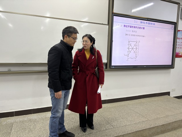 学院全体辅导员老师们一起深入课堂,实地了解学生课堂考勤和课堂教学开展的情况,并与师生互动。在走访《理论力学》、《结构力学Ⅰ》、《毛泽东思想和中国特色社会主义理论体系概论》、《土木工程材料》等课程后,黄磊对有序的课堂和浓厚的学习氛围表示肯定,并与任课教师和课堂学生进行了亲切的交流,询问教学计划并了解学生的学习目标。