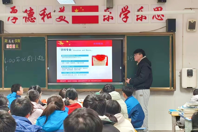 为加强高校与中学的联动,王恩浩同学回到高中母校开展东华理工大学核科学与工程学院专题宣传活动,向学弟学妹详细介绍东华理工大学的办学历史、学科优势及校园文化,并重点解读核科学与工程学院在教学改革、科研创新实力与人才培养特色。活动中,他结合自身学习经历,分享大学课程设计、实验实践及校园生活的真实体验,以鲜活案例打破高中生对“核专业”的认知壁垒。