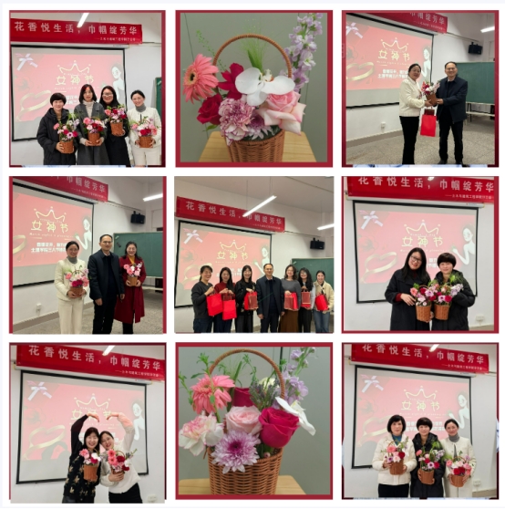 当天,学院领导班子走进活动现场开展暖心慰问。李明东书记为女教工代表送上鲜花,梁炯丰院长赠送定制文创礼品,以巾帼绽芳华寄语教育使命。活动中,女教职工们热情交流插花心得,互相展示创意成果,活动尾声全体手持作品合影留念,将春日里的优雅时光与教育情怀共同定格。