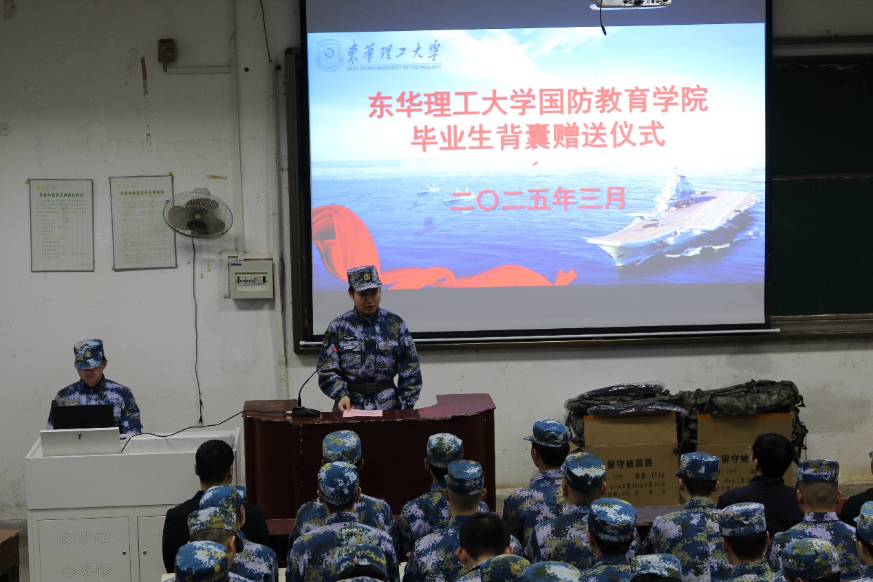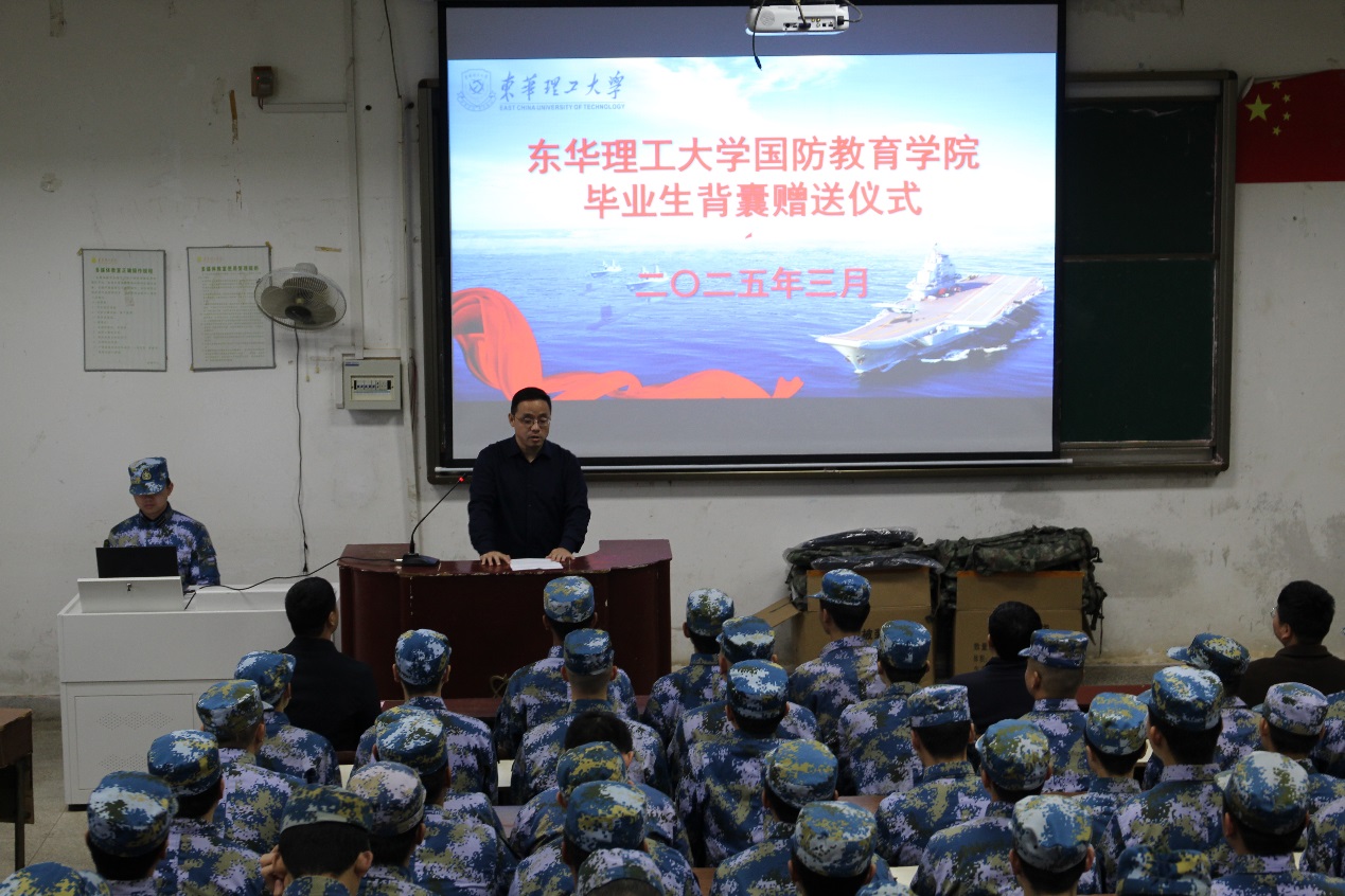 为加强毕业生入伍前教育,3月14日,国防教育学院在抚州学府校区信工楼阶六教室举行毕业生背囊赠送仪式。学院党委书记李儒俊、组织员兼班主任傅江辉、团委副书记郭佳磊、辅导员黄佳静、22中队全体定向培养军士以及23、24中队学生代表参加此次仪式。本次仪式由郭佳磊主持。