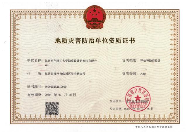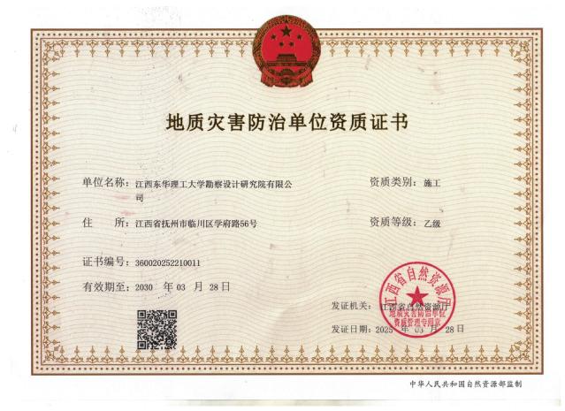 持续优化和完善资质体系,并进行多元化经营,是近年来江西东华理工大学勘察设计研究院有限公司的重要发展战略,为此,公司积极谋划,提前部署,按照《地质灾害防治单位资质管理办法》(中华人民共和国自然资源部令第8号)要求精心筹备各项申报材料,并得到了地科学院和地控学院的大力支持,经过一年的共同努力,完成了首次申报工作并成功获批,于2025年3月31日顺利取证,证书有效期为5年。