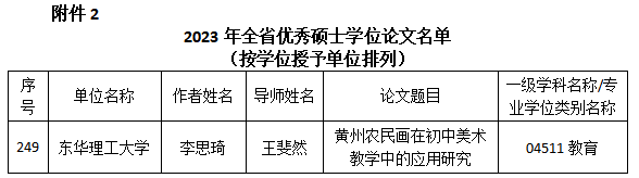 近日,江西省教育厅公布了《关于公布江西省优秀博士硕士学位论文名单的通知》(赣教高字〔2025〕5 号),我院王斐然副教授指导的研究生李思琦硕士学位论文《黄州农民画在初中美术教学中的应用研究》被评为江西省优秀硕士学位论文。(图/文 美术与设计学院)
