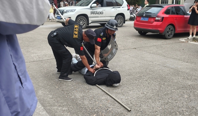在防恐防暴演练环节,我院学生自编自导,以感情纠纷为导火索,持棍追杀同学,并欲冲进教学楼,保卫处安保团队迅速启动应急预案,拿起防暴钢叉、警棍、防护盾牌等专业装备对暴力分子进行包围制服,通过团队协作和战术配合,安保人员成功控制现场局势,最终将“歹徒”制服。整个防恐防暴应急处置流程紧张有序,充分展示了我校安保人员的应急响应能力和团队协作精神。
