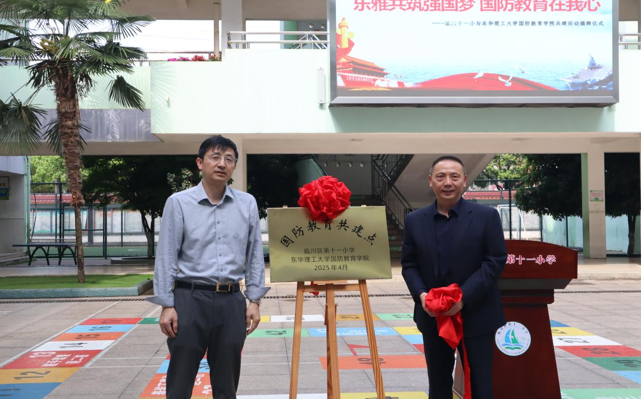 为贯彻落实新时代国防教育要求,强化青少年国防观念,培育爱国情怀,4 月 10 日,东华理工大学国防教育学院与临川十一小 “国防教育共建点” 揭牌仪式隆重举行。国防教育学院党委书记李儒俊、临川区教育体育局党委委员、副局长黄刚华、国防教育学院党委委员傅江辉、临川十一小部分校领导及定向培养军士代表15人参与了此次仪式。