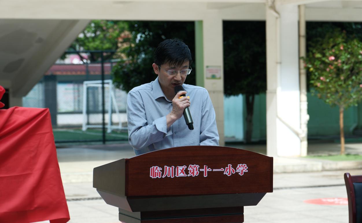 国防教育学院党委书记李儒俊发表讲话。他指出,青少年是国家的未来、民族的希望,临川区第十一小学坐落于西湖之畔、梦湖之滨,汲取山水之灵,传承文明之光。建校以来,学校注重学生综合素质的提升,注重爱国主义教育,赢得了社会的广泛赞誉。而东华理工大学是中国核工业第一所高等学府,是全国国防教育特色学校,为国家国防军工事业,为我国核大国地位的确立、国防科技工业发展发展作出了重要贡献。两校距离一路之隔,路相近,情相倾,因此,两校共建国防教育基地,既可以成为我校培养人民海军国民教育阶段的实践基地,也是临川区第十一小学拓展青少年赓续红色基因、增强国家安全观念、提升国防素质的重要渠道。